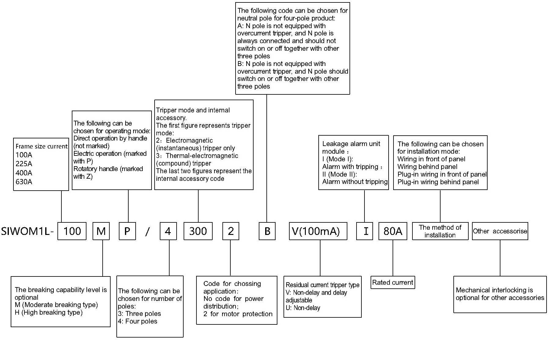 3、For SIWOM1L-100 and 225, two pairs of auxiliary contacts (namely, two normally open and two normally closed) may be provided for 220, 320, 240 and 340, which must be marked when ordering goods;