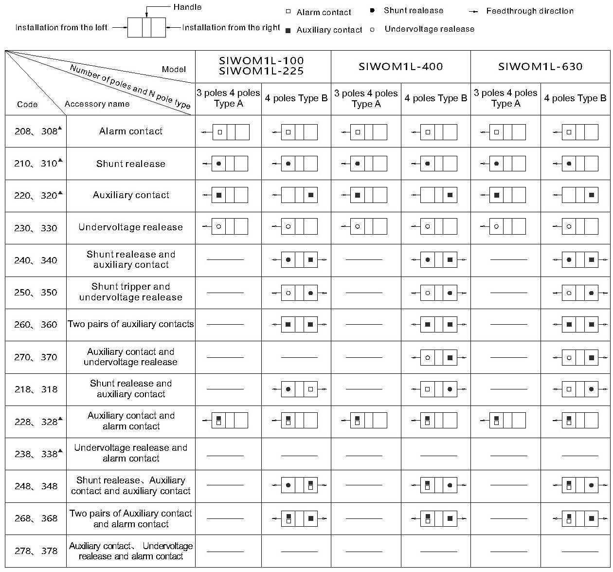2、For SIWOM1L-400, and 630, a pair of auxiliary contacts are provided for 228, 328, 248 and 348 (namely, one normally open and one normally closed) and three pairs of auxiliary contacts for 268 and 368 (namely, three normally open and three normally closed);