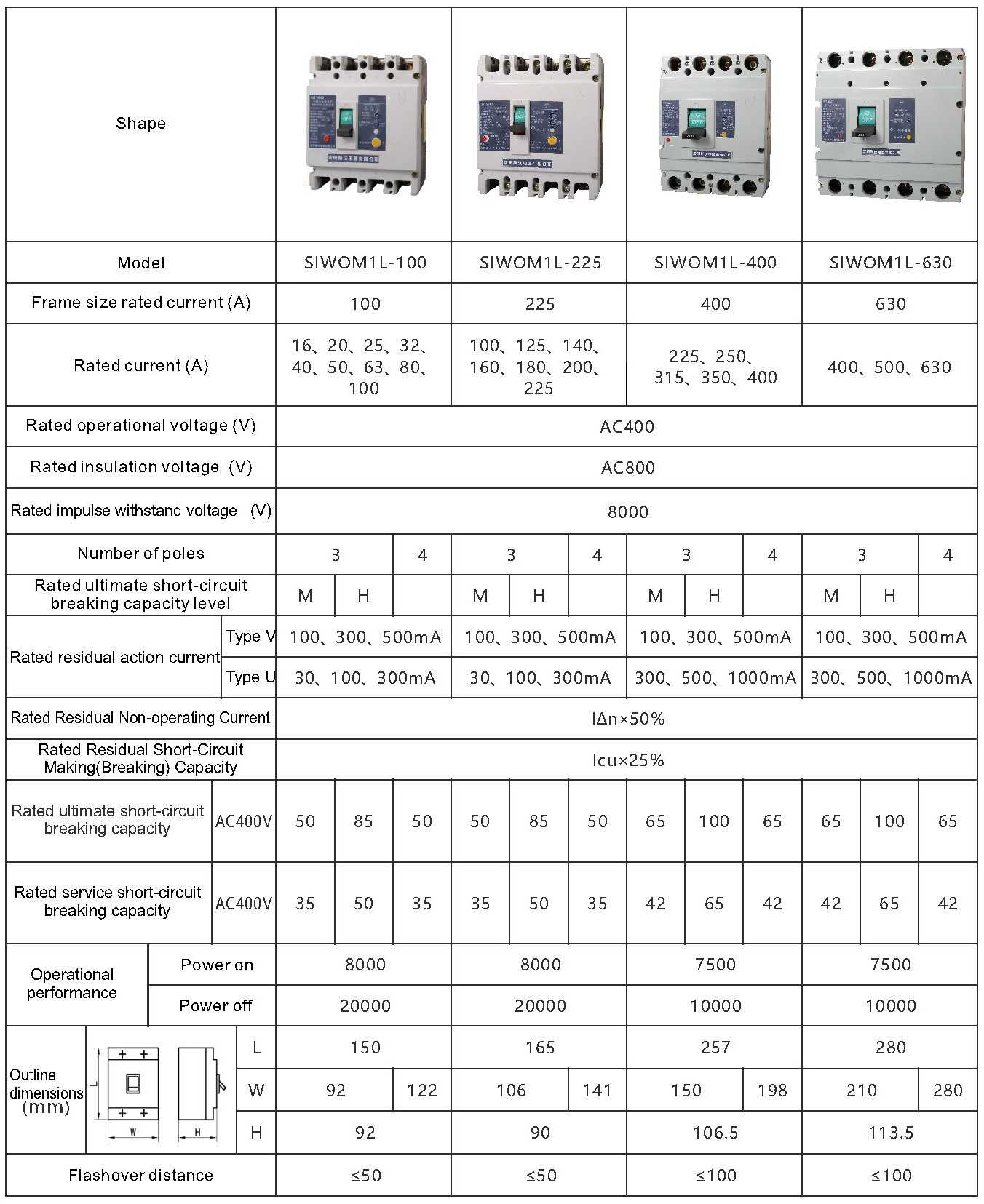 5、Interchangeability: The outline dimensions and installation dimensions are the same as SIWOM1 circuit-breakers with the same specifications (SIWOM1L-630 is the same as SIWOM 1-800), and the installation has good interchangeability