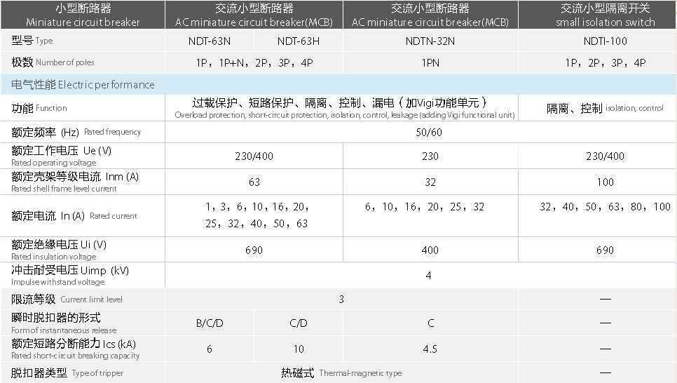 The Mini Circuit Breakers are suitable for 50Hz, rated voltage 230V/400V, rated current 1-63A and used for electrical equipment overload and short circuit protection.