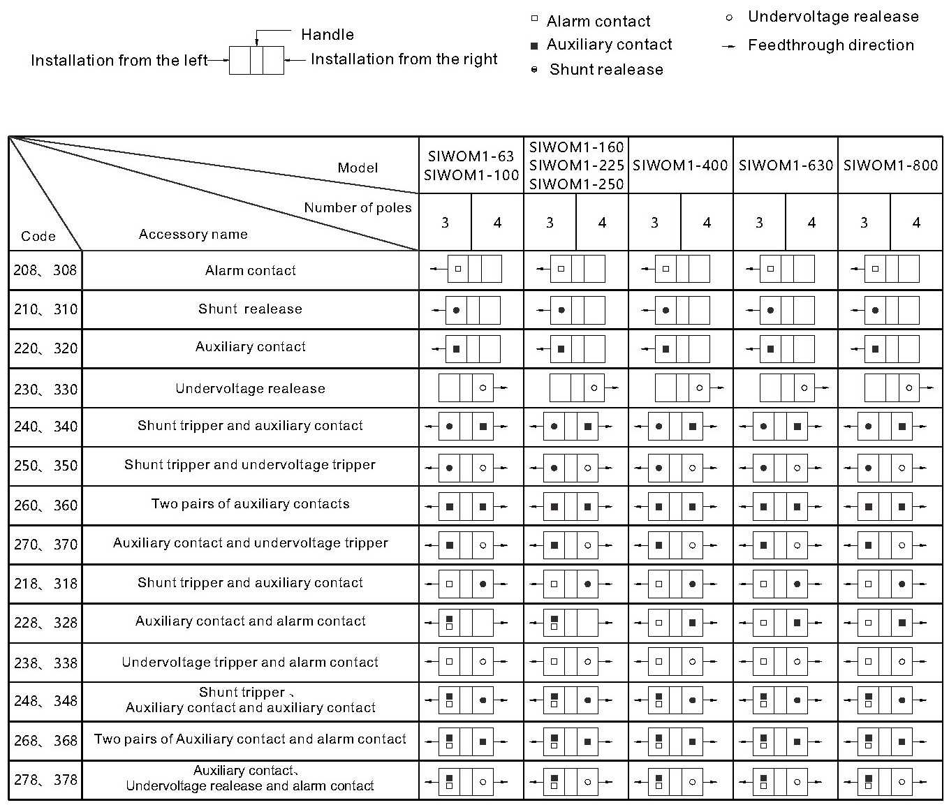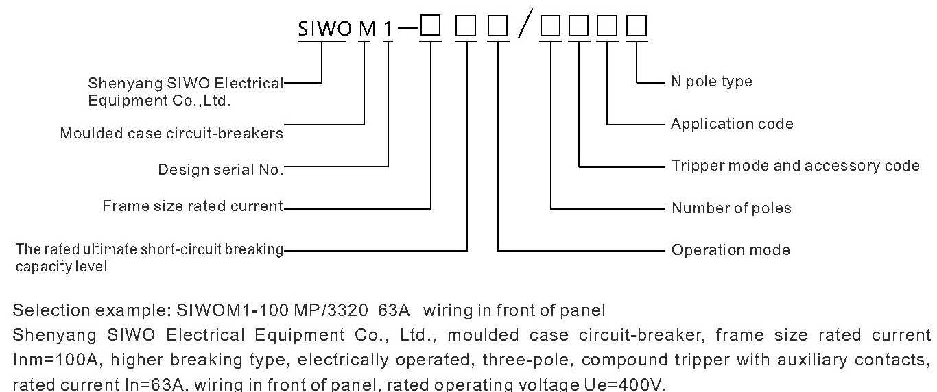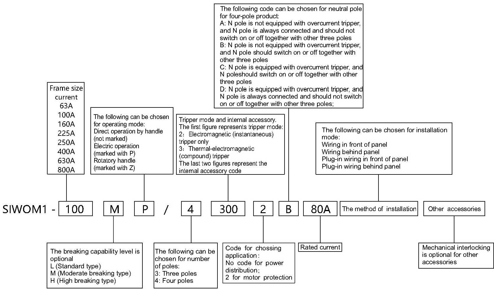 2、For SIWOM1-100, 160, 225 and 250 four-pole circuit-breakers, when N pole is Type A and Type D, 240, 340, 360, 260, 268, and 368 are not available;