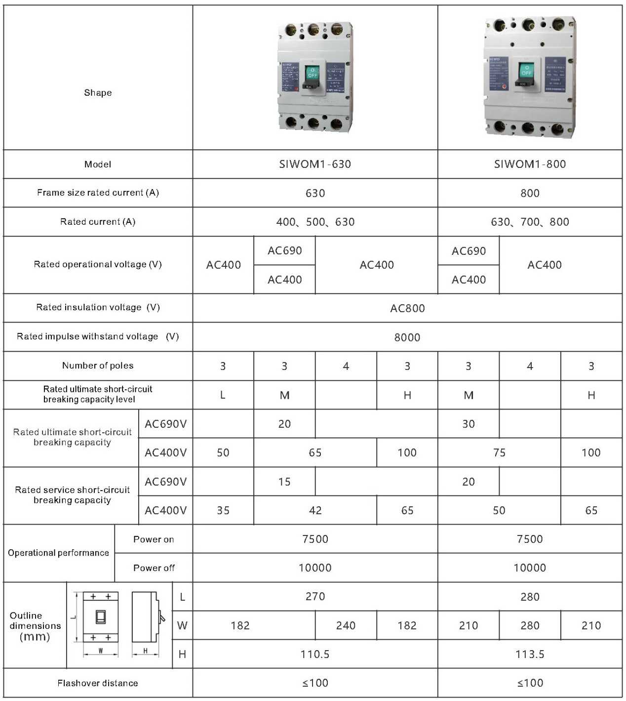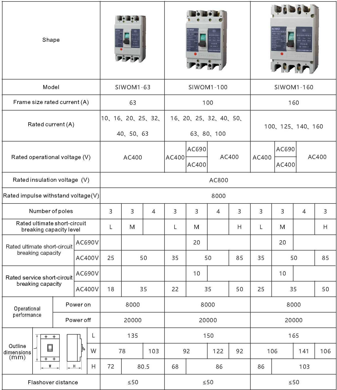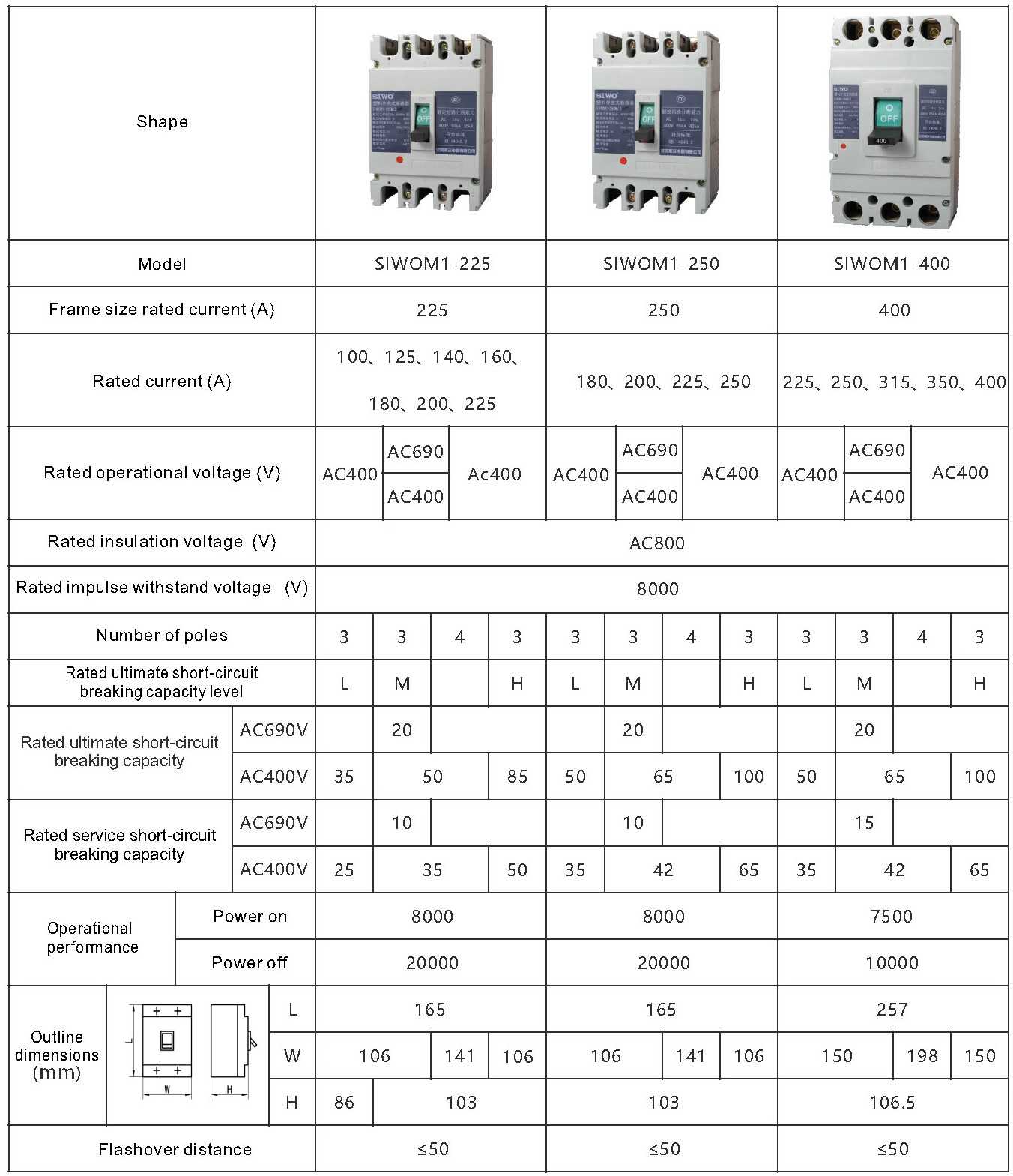 SIWOM1 moulded case circuit-breakers (hereinafter referred to as circuit-breakers) use thermomagnetic tripper and they are developed and manufactured by the Company with the latest circuit-breaker technology. The circuit-breakers are featured by good-looking appearance, compact structure, long service Iife, low rated power consumption, stable performance, easy installation and superior performance, and they provide users with safe and reliable Protection. The circuit breaks has disconnecting function
